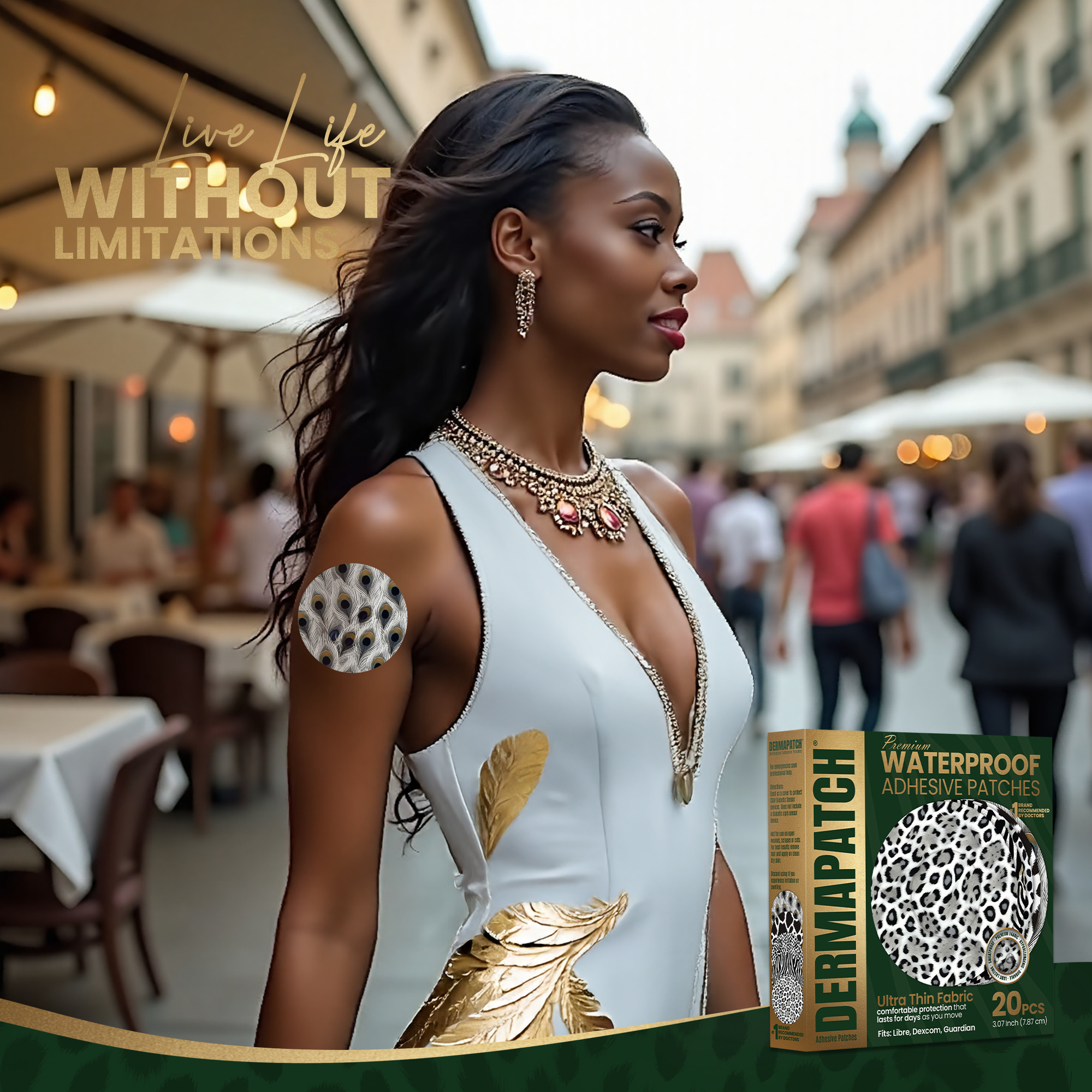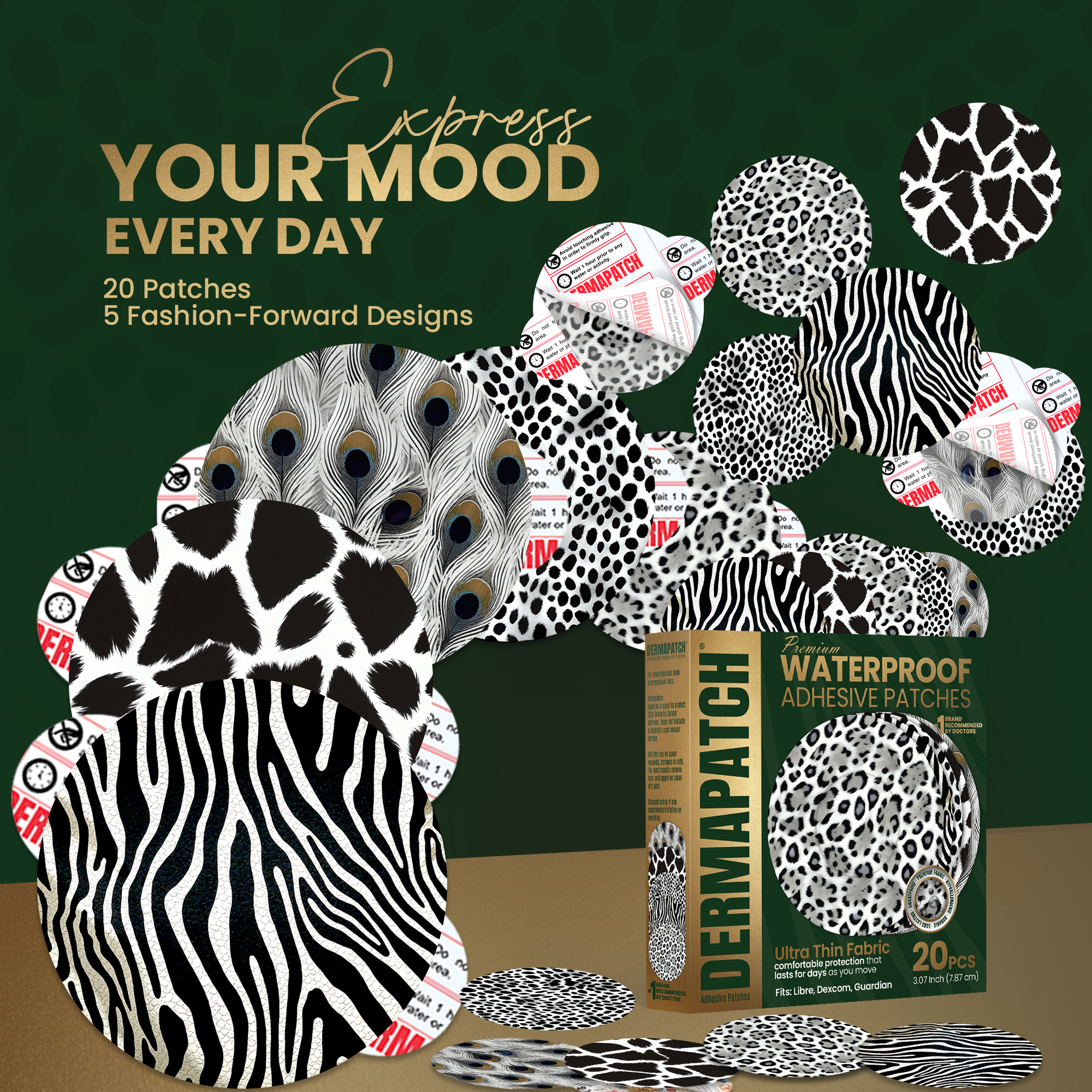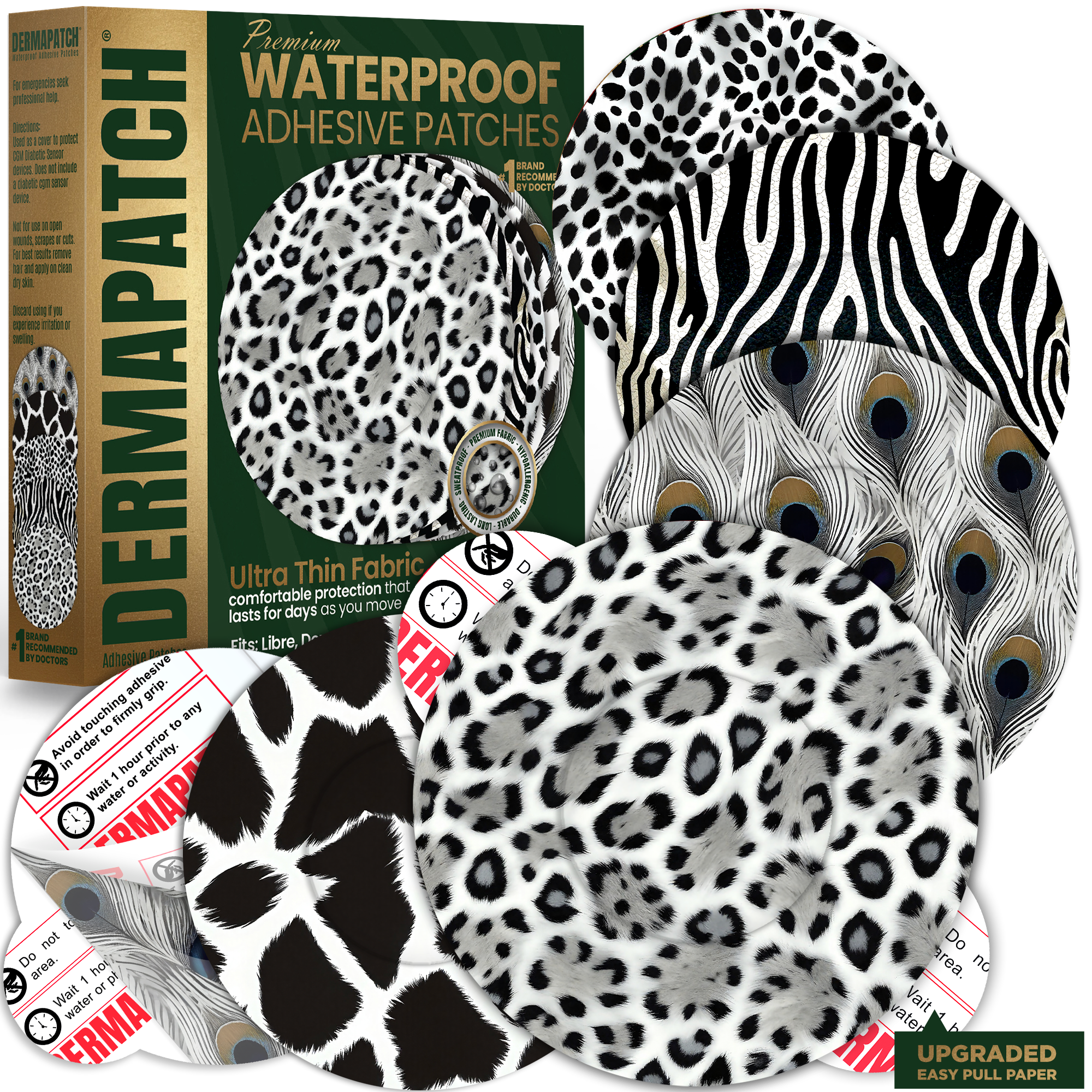 DERMAPATCH® CGM Adhesive Patches are versatile, durable, easy to use, soft, comfortable, lightweight, non-toxic, non-irritating, tear resistant, wrinkle resistant and hold shape in cold and hot temperatures  making DERMAPATCH® the number once choice for CGM device protection and freedom to do as you want when you want. White Animal Skin Patterns (Zebra, Leopard, Peacock, Cow and Fox)